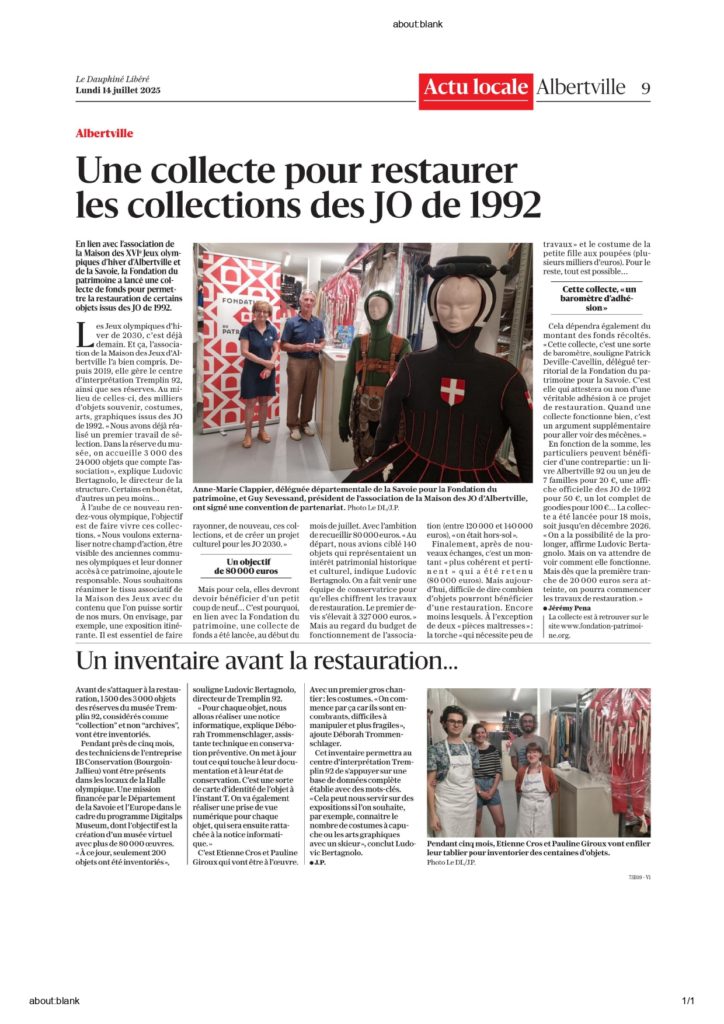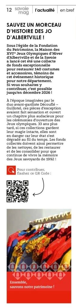 La Maison des XVIe Jeux Olympiques d’Hiver d’Albertville et de la Savoie (MJO) est fière d’annoncer le lancement officiel de sa collecte de fonds exceptionnelle, dédiée à la restauration d’une partie de ses collections et menée sous l’égide de la Fondation du Patrimoine. Initiée le 3 juillet 2025, la collecte s’étendra sur une période de 18 mois jusqu’en décembre 2026.